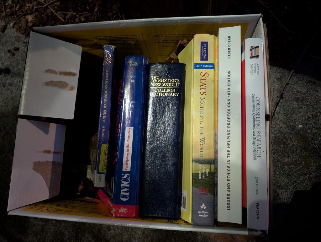 What good is knowledge, they must have asked, when they cast these books out? Knowledge was what got Adam and Eve cast out too. Because it doesn’t always help. You can counsel, you can help, professionally. But the promise that this will be “the relied-upon, essential resource for students in any helping field,” and “the book many students return to well into their professional careers” hasn’t borne fruit, has it? Or has it borne the kind of fruit that gets you pushed out as fast as a 10th edition text when the 11th edition comes out? The second edition of Counseling Research, too, has no place in a world that contains the third edition. Time just makes fools of us all.