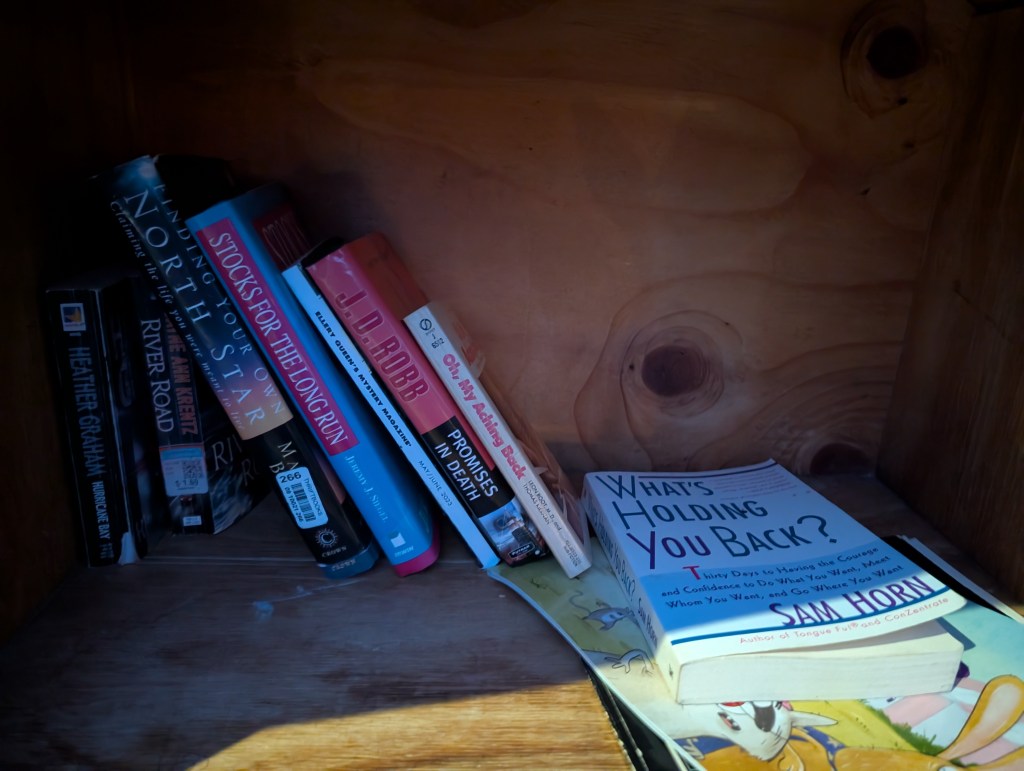 Obviously, as we search for our first clue to the meaning of this Little Free Library’s interior, the first thing we notice is the repetition between “What’s holding you back?” and “Oh, my aching back.”