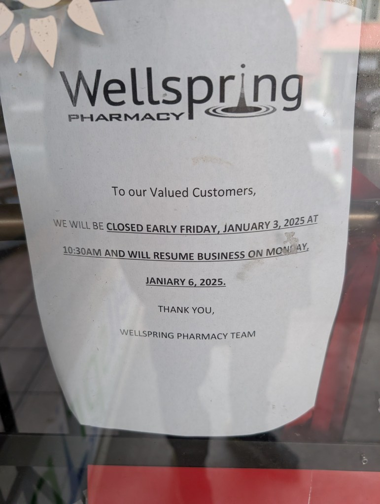Wellspring is not my usual pharmacy. It was my pharmacy at some point in the distant past, though when I try to remember when, I’m picturing Covid precautions, real mid-2020 shit, back when someone standing too close to you was real “wtf you doing” stink-eye territory. That was the distant past, in my mind.